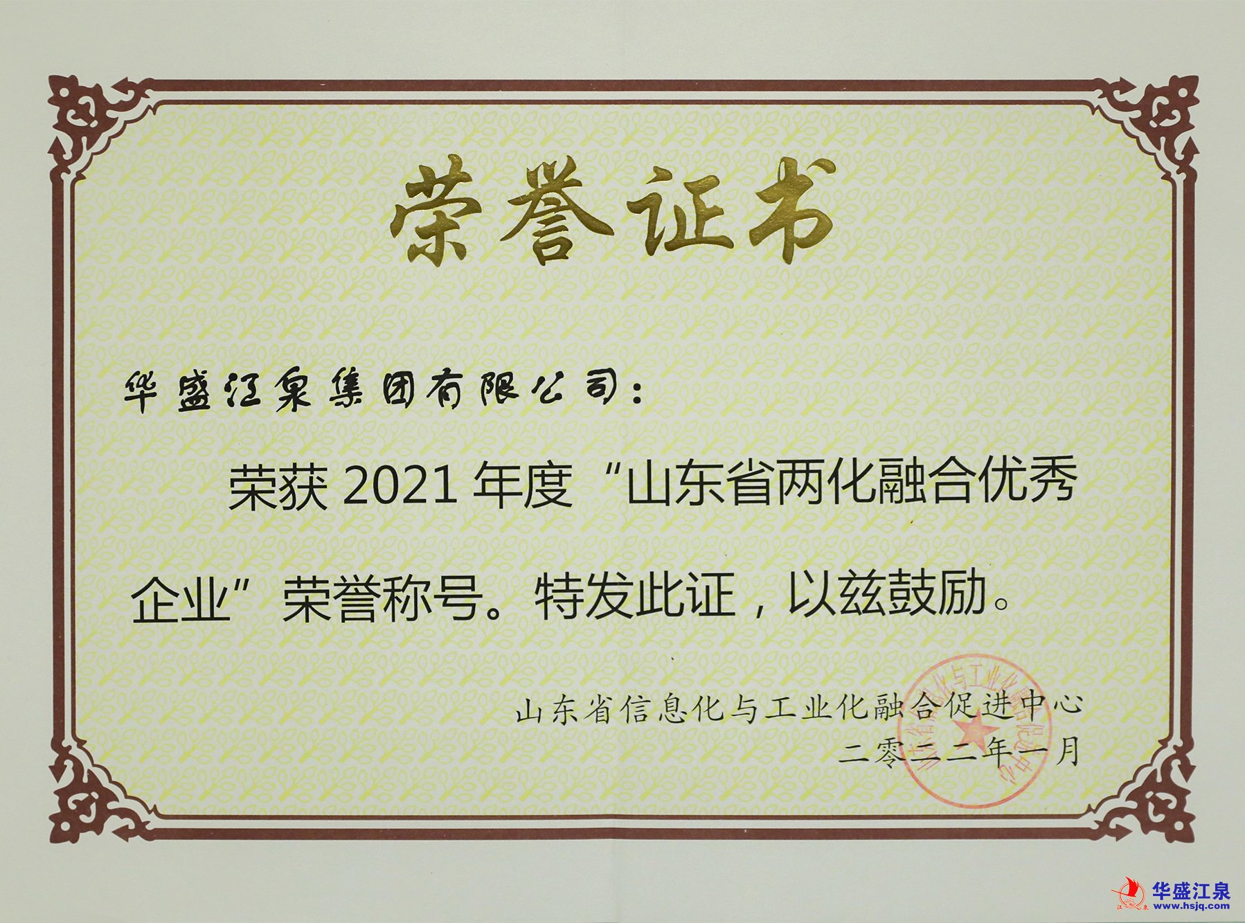 近日,經(jīng)山東省兩化融合相關(guān)部門及專家團共同審核評定,華盛江泉集團獲得“2021年度山東省兩化融合優(yōu)秀企業(yè)”榮譽稱號,這是繼2018年后集團再度獲評省級兩化融合優(yōu)秀企業(yè)稱號。